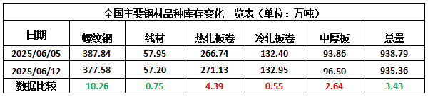 本期,全国35个主要市场样本仓库钢材总库存量为935.36万吨,周环比减少3.43万吨,降幅为0.37%。主要钢材品种中,螺纹钢库存量为377.58万吨,环比减少10.26万吨,降幅为2.65%;线盘库存量为57.20万吨,周环比减少0.75万吨,降幅为1.29%;热轧卷板库存量为271.13万吨,周环比增加4.39万吨,增幅为1.65%;中厚板库存量为96.50万吨,周环比增加2.64万吨,增幅为2.81%;冷卷板库存量为132.95万吨,周环比增加0.55万吨,增幅为0.42%。