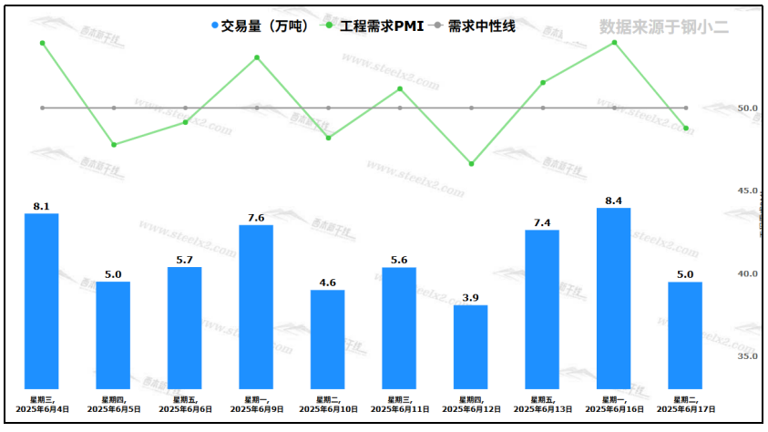 据钢小二平台样本数据,6月17日采样全国工程需求量为5万吨,环比上个交易日下降40%,工程需求pmi落回需求中心线下方,日环比下降5.2个百分点。
