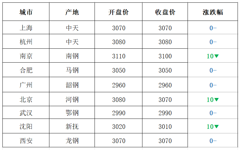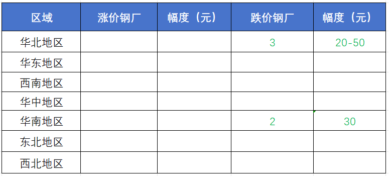 钢厂方面:据不完全统计,上个交易日国内5家钢厂建材出厂价格出现调整,调价钢企全线下调。