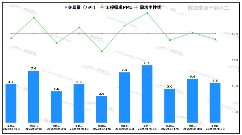 据钢小二平台样本数据,6月19日采样全国工程需求量为5.8万吨,环比上个交易日下降9.3%,工程需求pmi跌回需求中心线下方,日环比下降1.3个百分点。