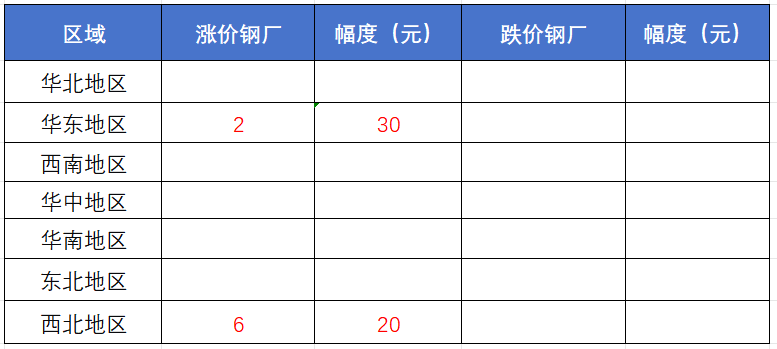 钢厂方面:据不完全统计,上个交易日国内8家钢厂建材出厂价格出现调整,调价钢企全线上调。