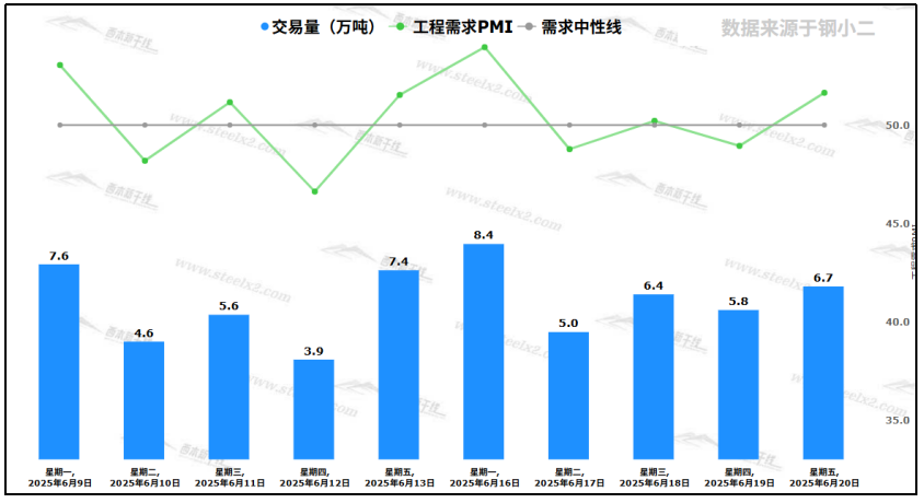 据钢小二平台样本数据,6月20日采样全国工程需求量为6.7万吨,环比上个交易日增加15%,工程需求pmi升至需求中心线上方,日环比增加2.7个百分点。