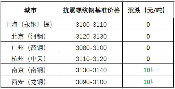 截至午间,国内部分市场螺纹钢(抗震)基价如下:上海市场3100-3110元/吨;北京市场3120-3130元/吨;广州市场3080-3100元/吨;杭州市场3110-3120元/吨;南京市场3130-3140元/吨;西安市场3090-3100元/吨。环比来看,截至上午收盘,全国主要市场一线品牌价格持平,局部小跌。