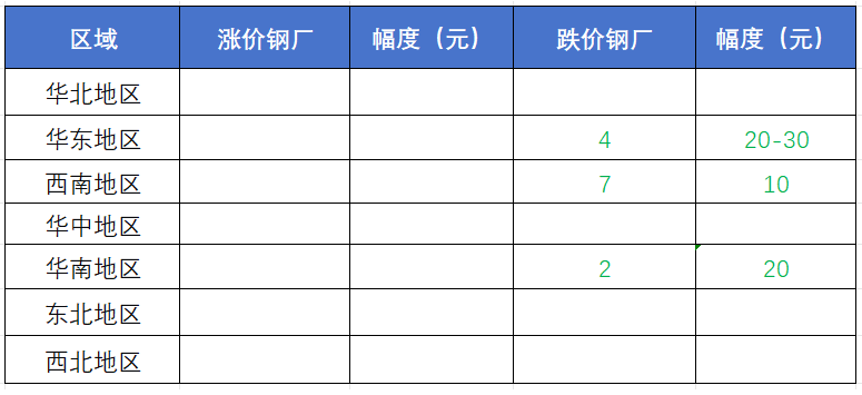钢厂方面:据不完全统计,上个交易日国内13家钢厂建材出厂价格出现调整,调价钢企全线下调。
