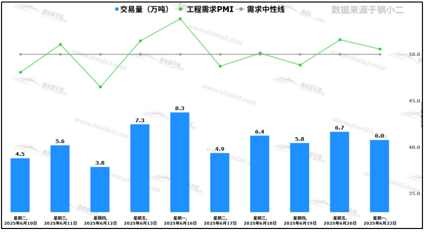 据钢小二平台样本数据,6月23日采样全国工程需求量为6万吨,环比上个交易日下降10%,工程需求pmi接近需求中心线,日环比下降1个百分点。