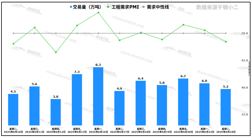 据钢小二平台样本数据,6月24日采样全国工程需求量为5.2万吨,环比上个交易日下降13%,工程需求pmi跌落需求中心线下方,日环比下降2.2个百分点。