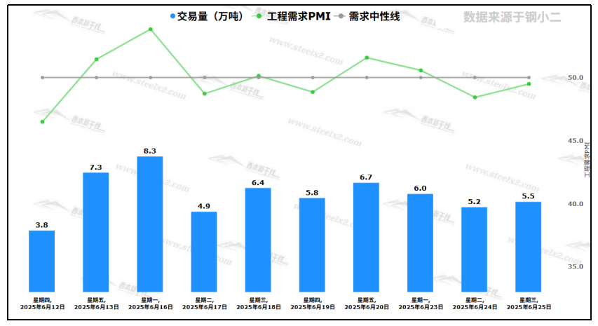 据钢小二平台样本数据,6月25日采样全国工程需求量为5.5万吨,环比上个交易日上涨5.7%,工程需求pmi接近需求中心线,日环比上升1.1个百分点。